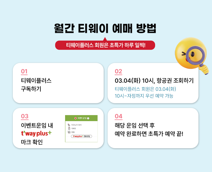 티웨이항공 월간 프로모션 참여는 오는 3월 4일 오전 10시부터 3월 9일까지 진행됩니다. 구독형 멤버십 '티웨이플러스' 회원이라면 3월 4일 오전 10시부터 당일 자정까지만 티켓팅이 가능하고, 그 외 모든 회원은 다음날인 5일 오전 10시부터 9일 자정까지 참여가 가능합니다.