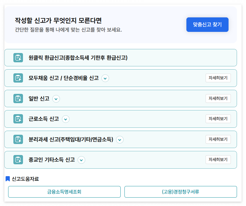 자신이 어떤 소득에 대해 신고를 해야할 지 모른다면 국세청 홈택스 종합소득세 신고에서 '나에게 맞는 맞춤신고 찾기'를 통해 신고할 내역을 찾아보세요!
