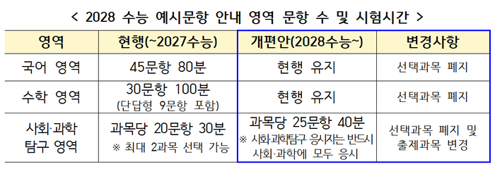 - 사회탐구/과학탐구: 각각 ‘통합사회’, ‘통합과학’으로 전환, 25문항 40분 운영