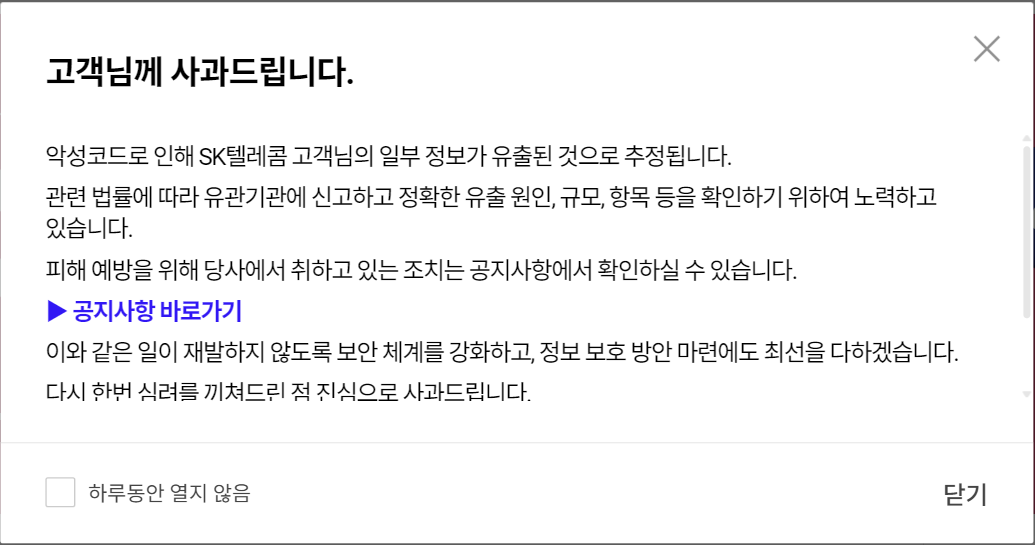 2025년 4월 18일, SKT는 해커의 악성코드 공격으로 인해 이동 가입자 식별번호(IMSI), 단말기 고유식별번호(IMEI) 등 일부 유심 정보가 외부로 유출된 정황을 확인했습니다.